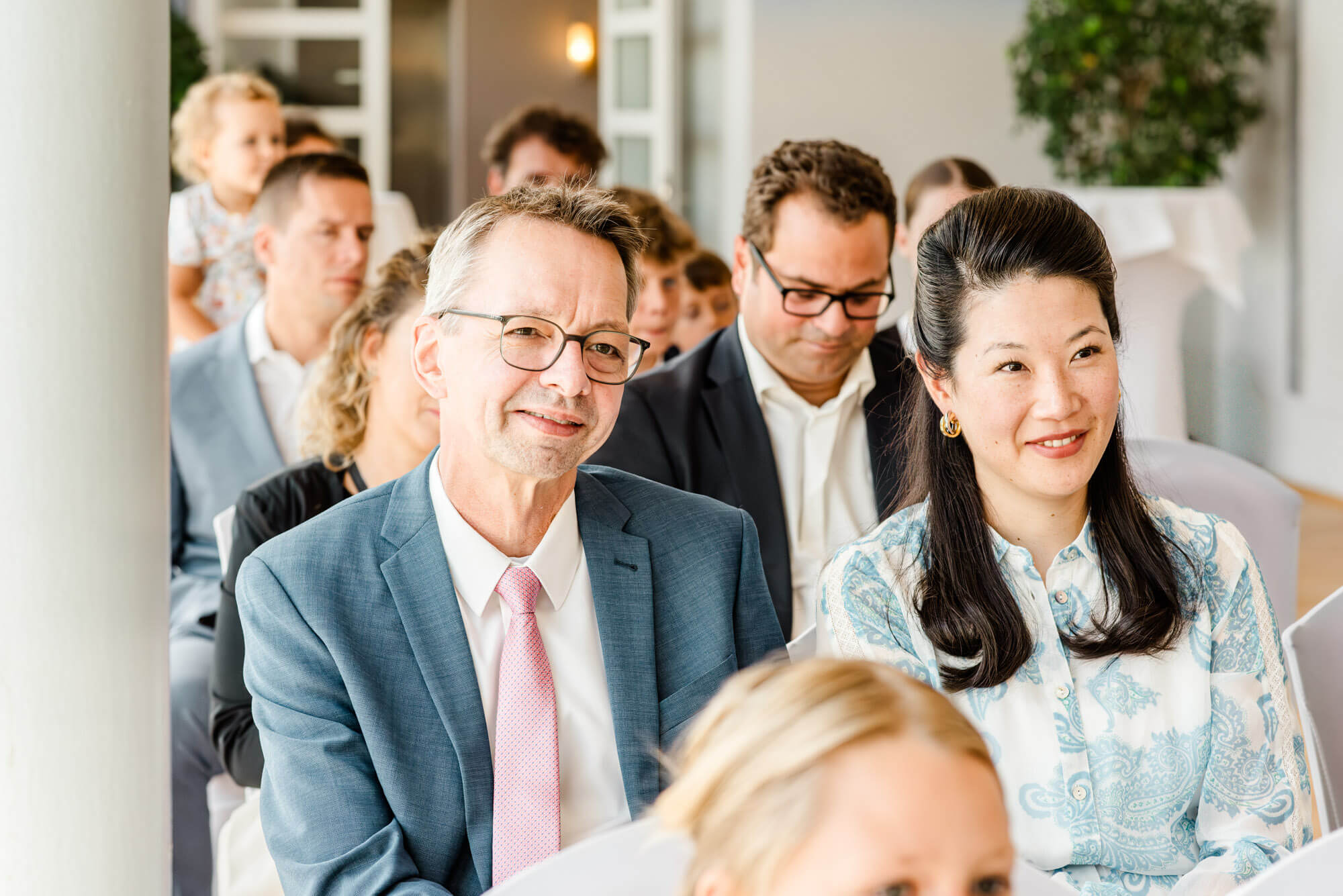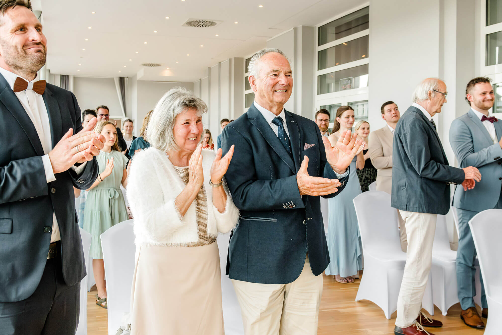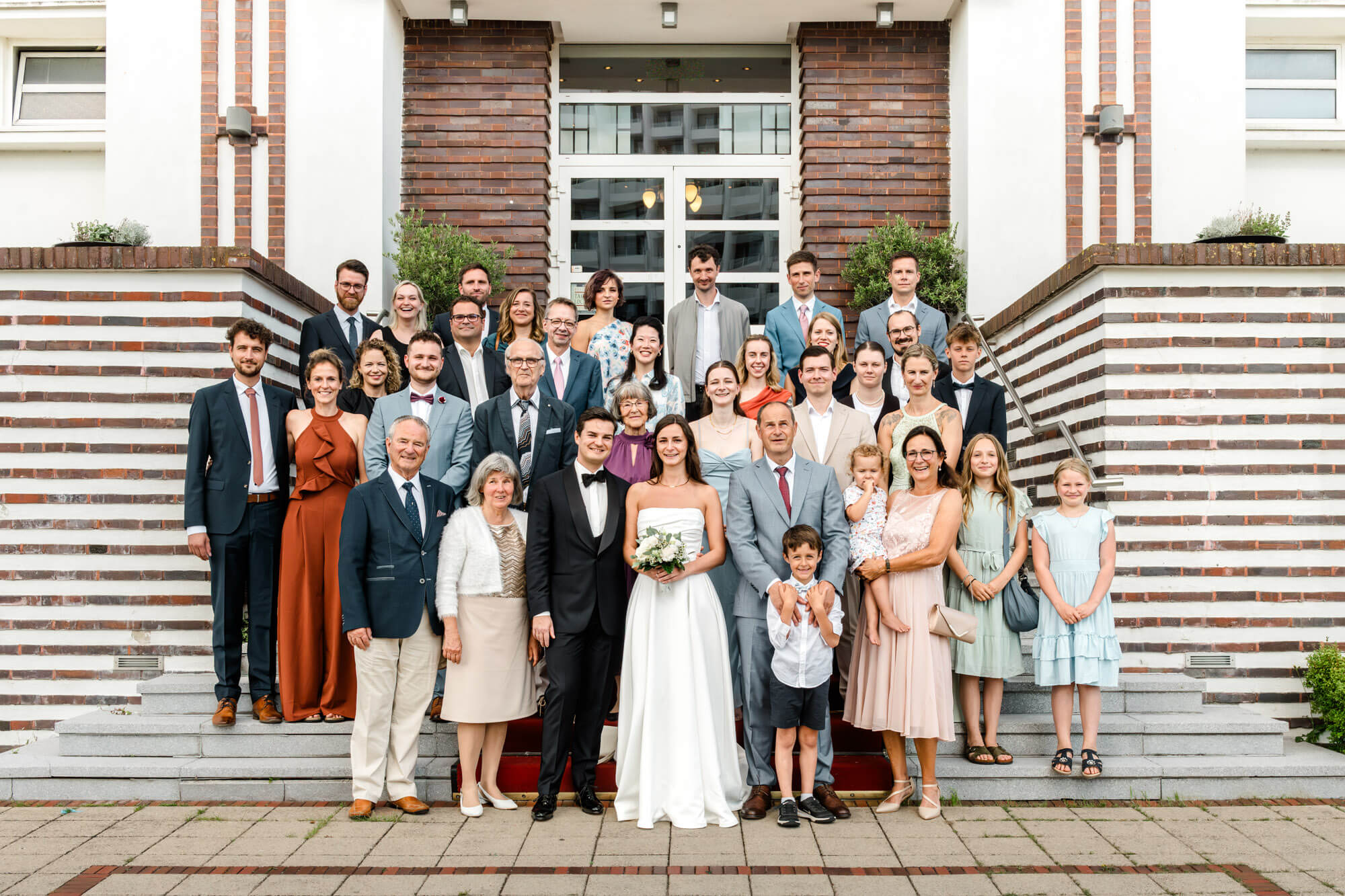 Nach der Trauung folgten die Gratulationen und ein Gruppenfoto. Mit rund 35 Gästen war alles überschaubar und entspannt. Im Anschluss ging es zur Feierlocation im selben Gebäude, nur einmal ums Kurhaus herum.