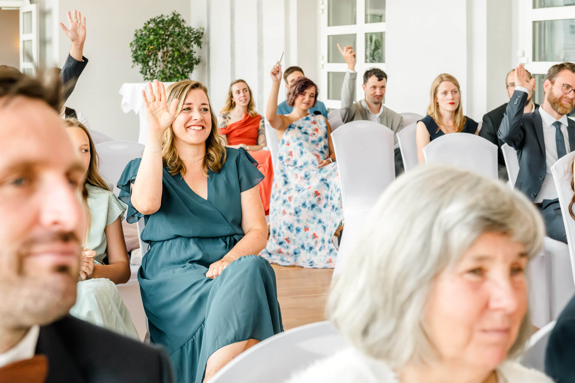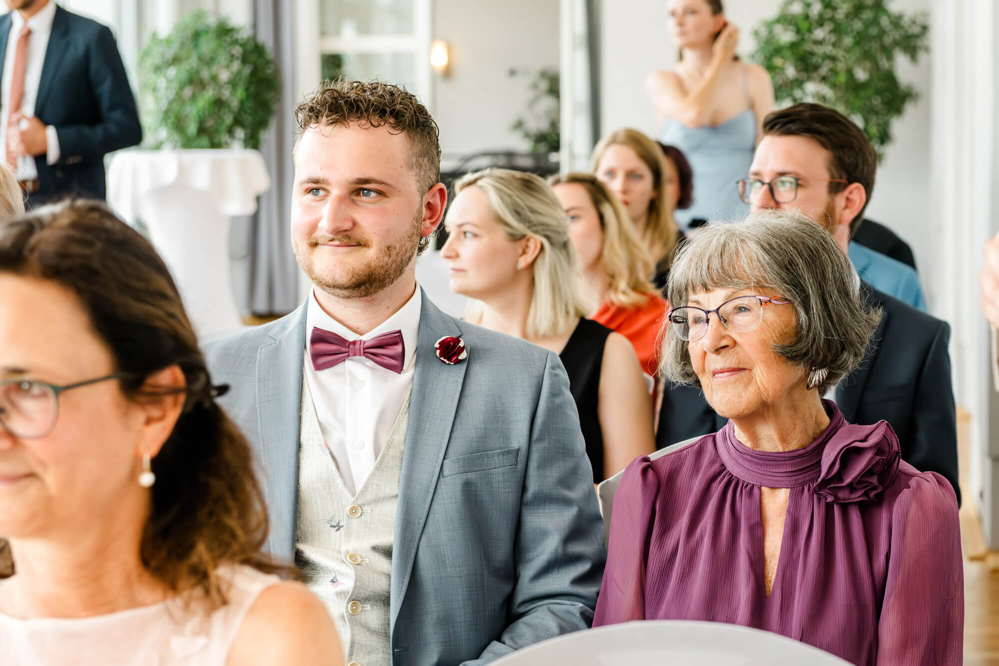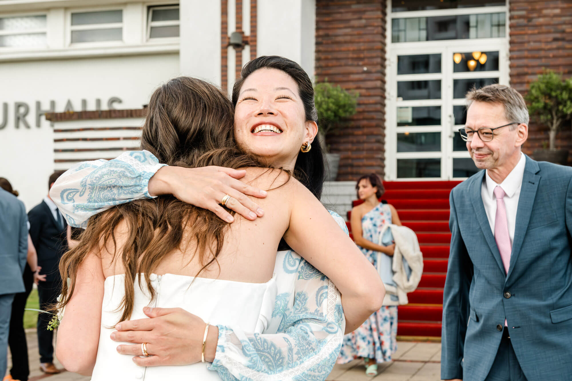 Nach der Trauung folgten die Gratulationen und ein Gruppenfoto. Mit rund 35 Gästen war alles überschaubar und entspannt. Im Anschluss ging es zur Feierlocation im selben Gebäude, nur einmal ums Kurhaus herum.