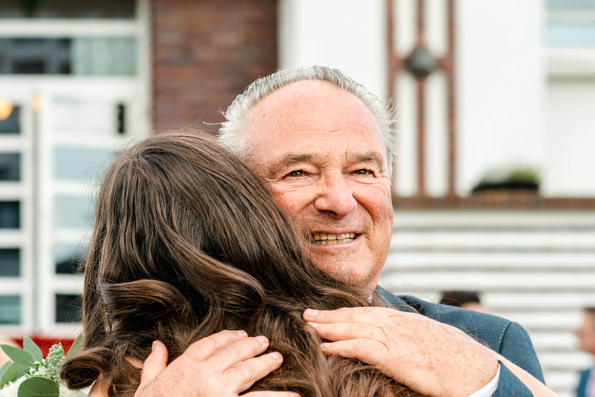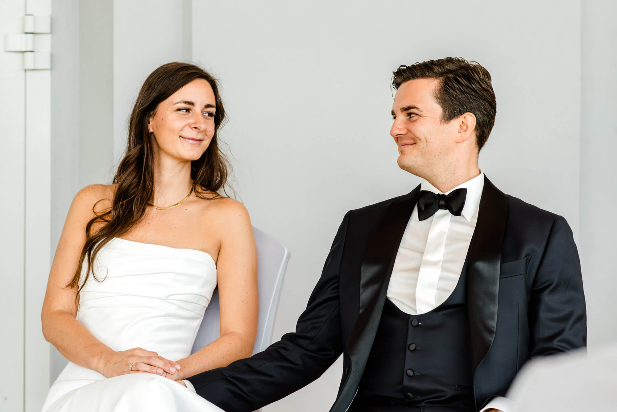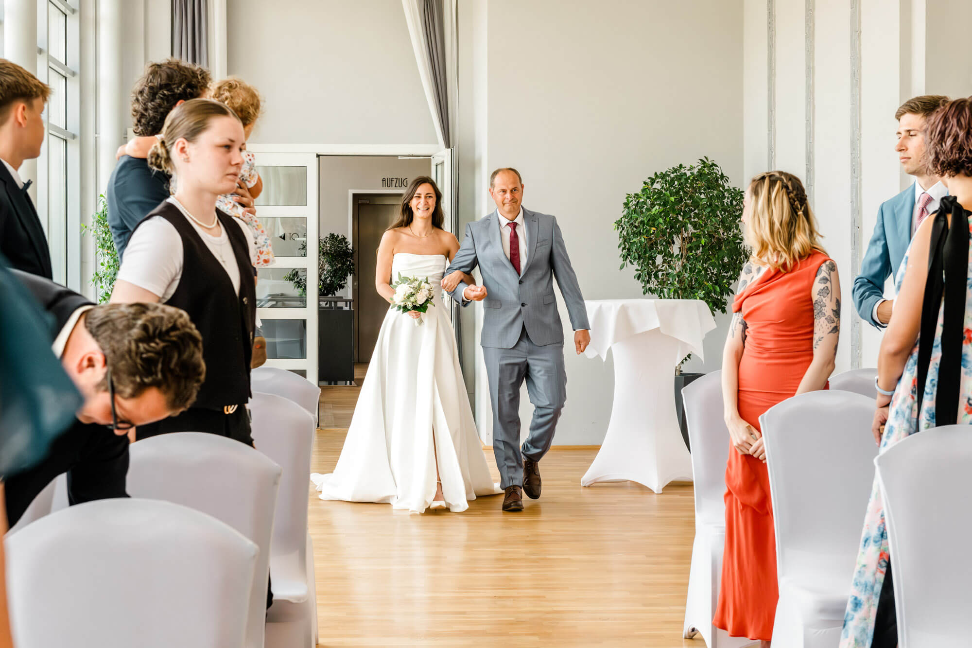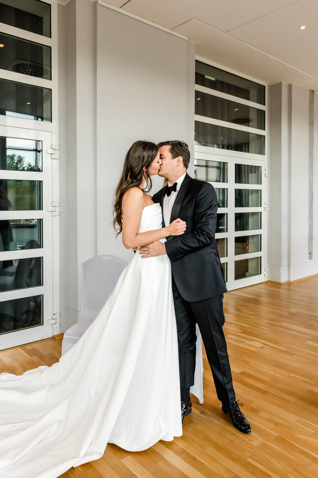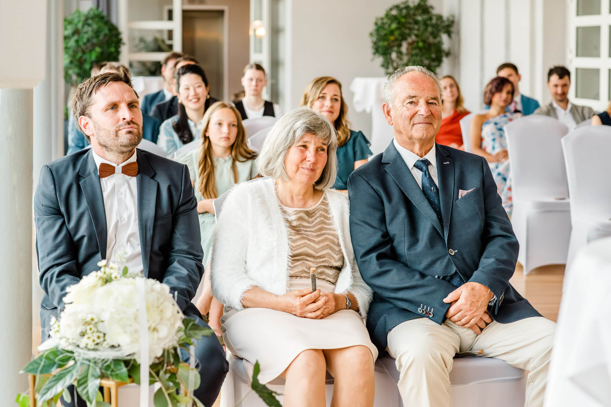 Die freie Trauung wurde von Fanny von Black White Bliss (Herzensempfehlung!) begleitet und war sehr persönlich auf das Paar abgestimmt. Die Hochzeitslocation Kurhaus Warnemünde bietet durch die großen Fensterfronten ein sehr gleichmäßiges Licht – gerade für Fotos ein großer Vorteil: Keine harten Schatten, keine dunklen Ecken, sondern eine klare und ruhige Bildwirkung.