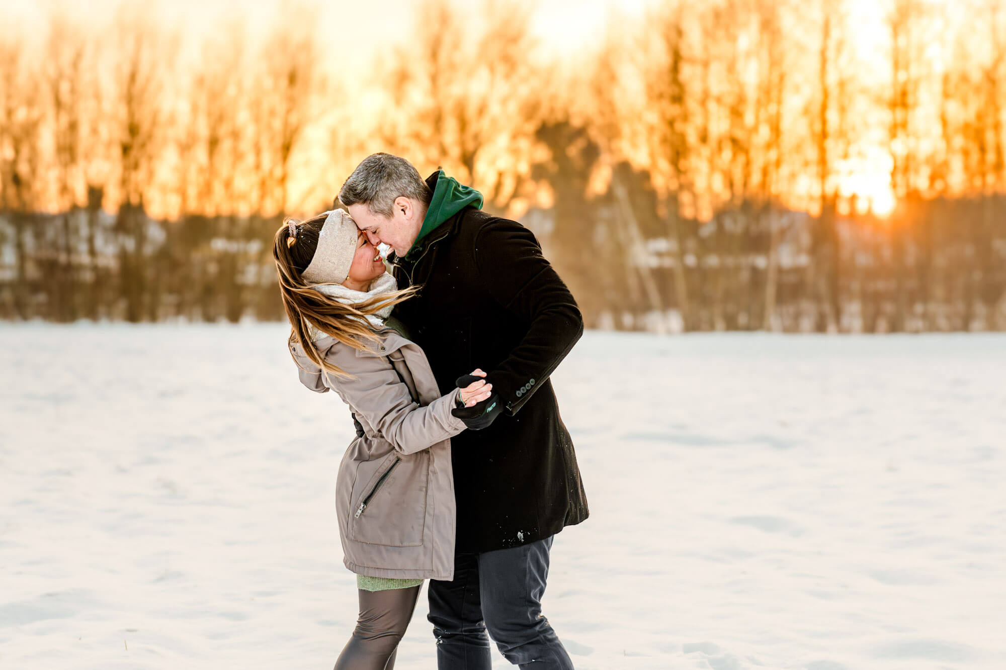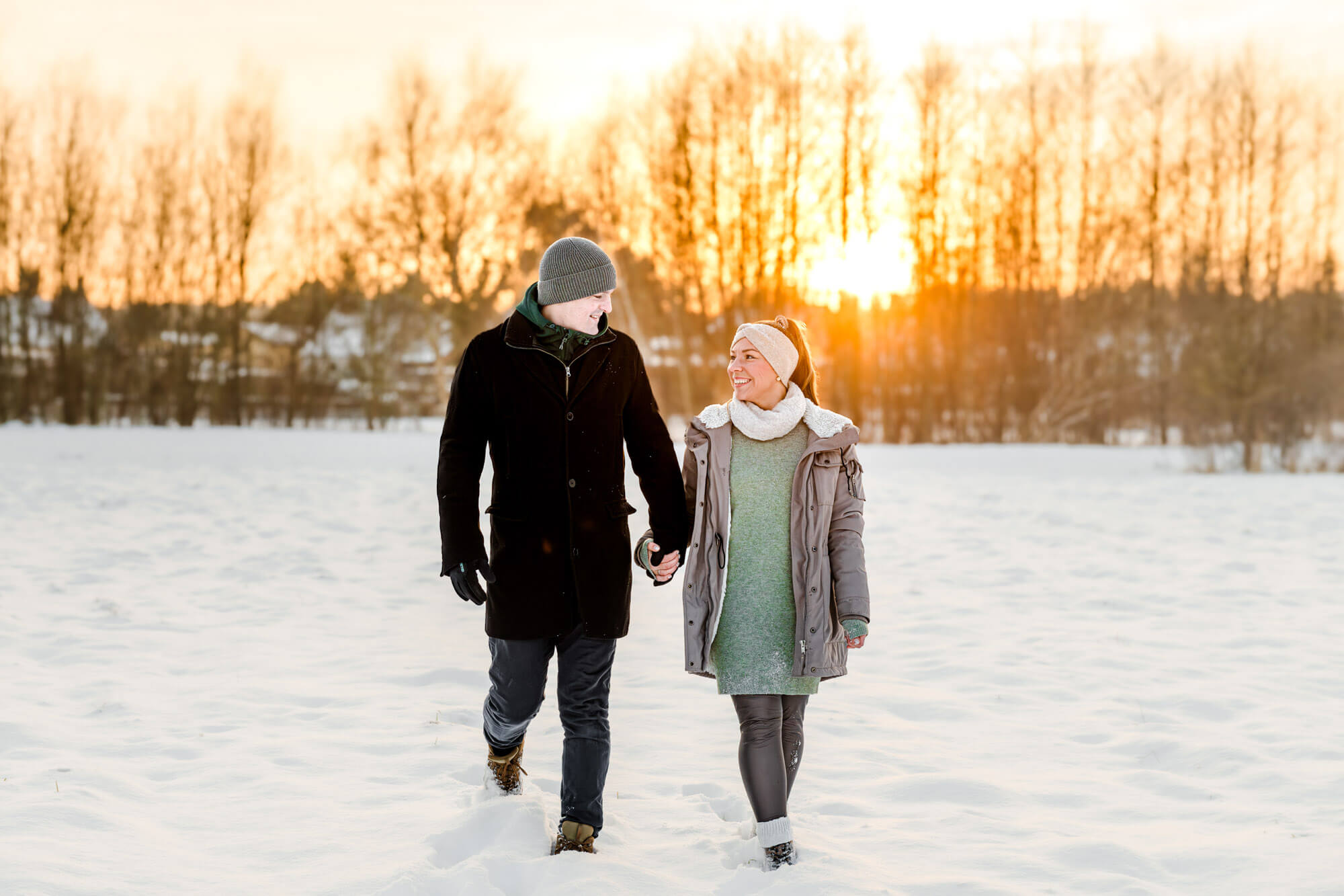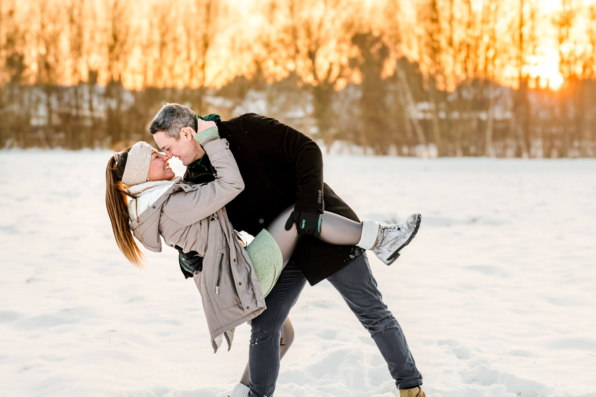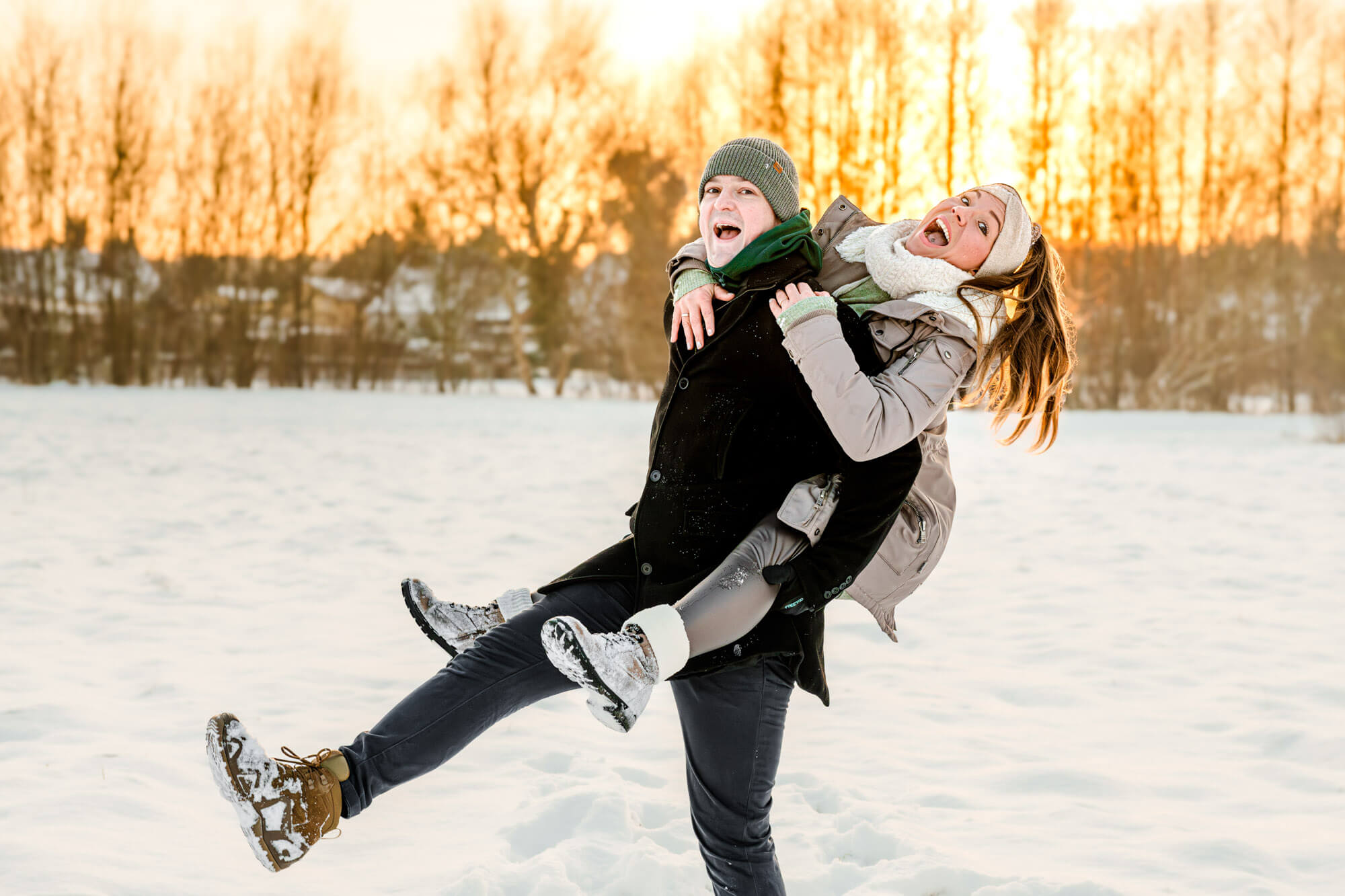 Bei diesem Paar-Fotoshooting im Winter haben wir die goldene Stunde genutzt, Schnee geworfen und viel gelacht. Huckepack, Hebefigur, hochgehoben werden, zwischendurch einfach laufen lassen. Genau diese Mischung aus Aktion und Momenten dazwischen macht für mich gute Paarfotos aus.